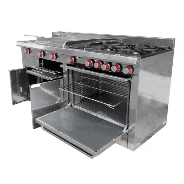 2 PARRILLAS NIQUELADAS DENTRO. 1 TERMOSTATO IMPORTADO RANGO DE 100 A 300°C VALVULA DE SEGURIDAD INTEGRADA. 1 QUEMADOR TUBULAR EN ACERO INOX. DE 36,000 B.T.U./H PUERTA CON BISAGRAS Y EMPAQUE PERIMETRAL PARA CIERRE HERMETICO. 2 GABINETES CON PUERTA BAJO LA FREIDORA Y EL GRATINADOR.